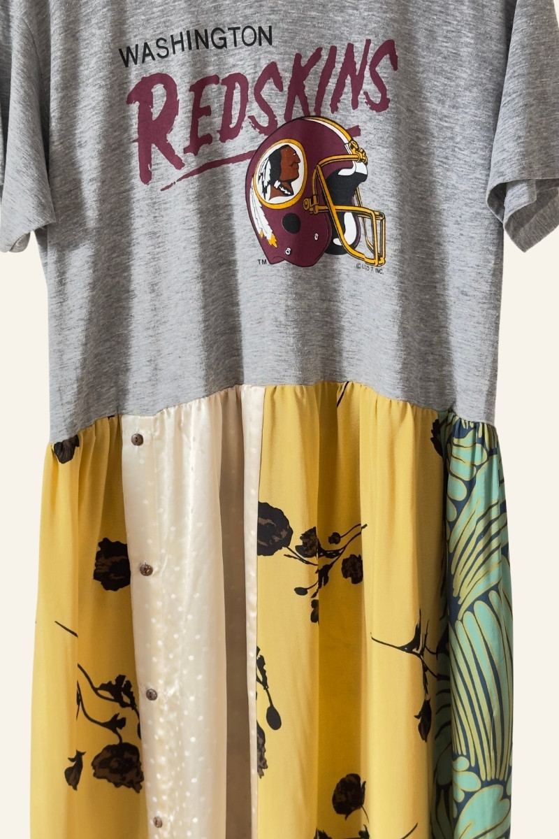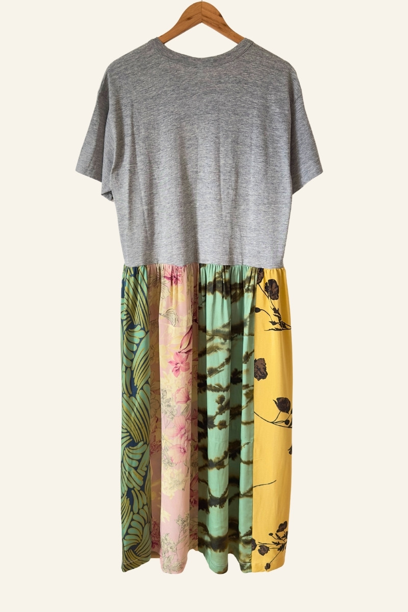 Robe, pièce unique réalisée à partir d’un tee-shirt vintage neuf made in USA et d’un patchwork d’ imprimés.