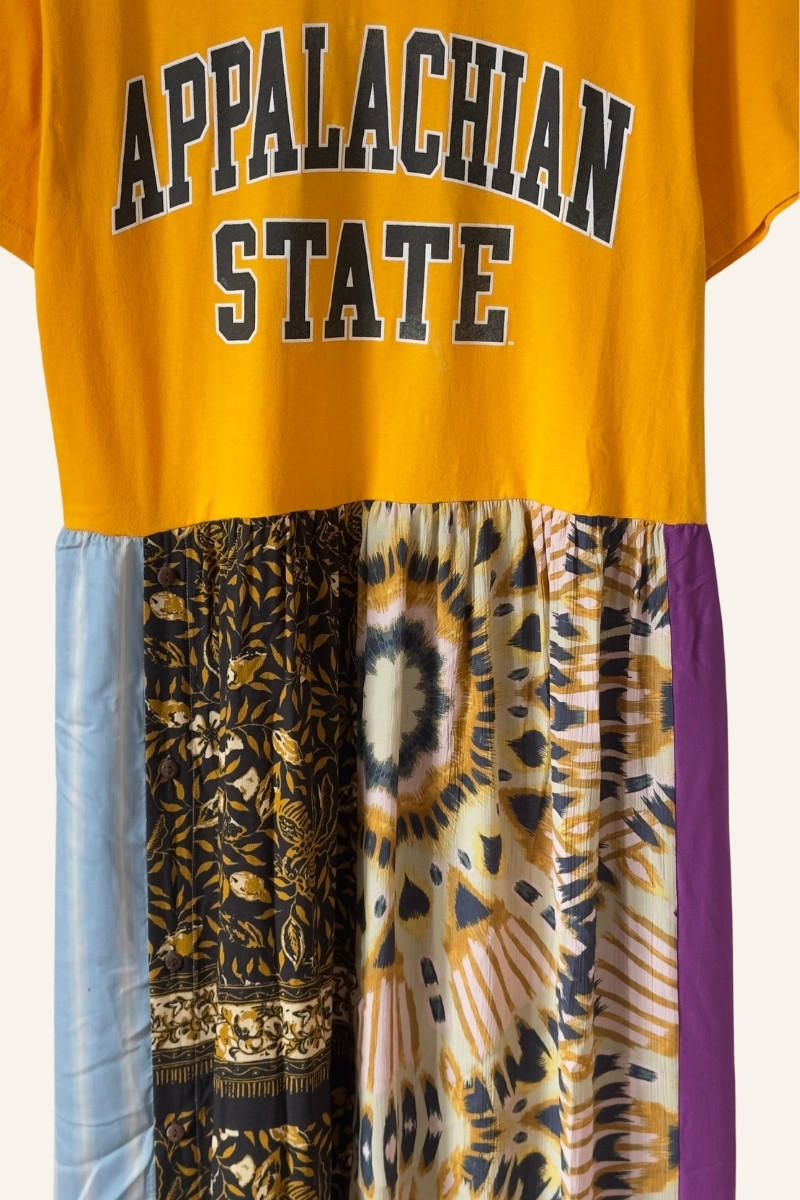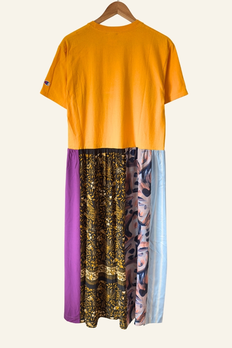 Robe, pièce unique réalisée à partir d’un tee-shirt vintage et d’un patchwork d’ imprimés.