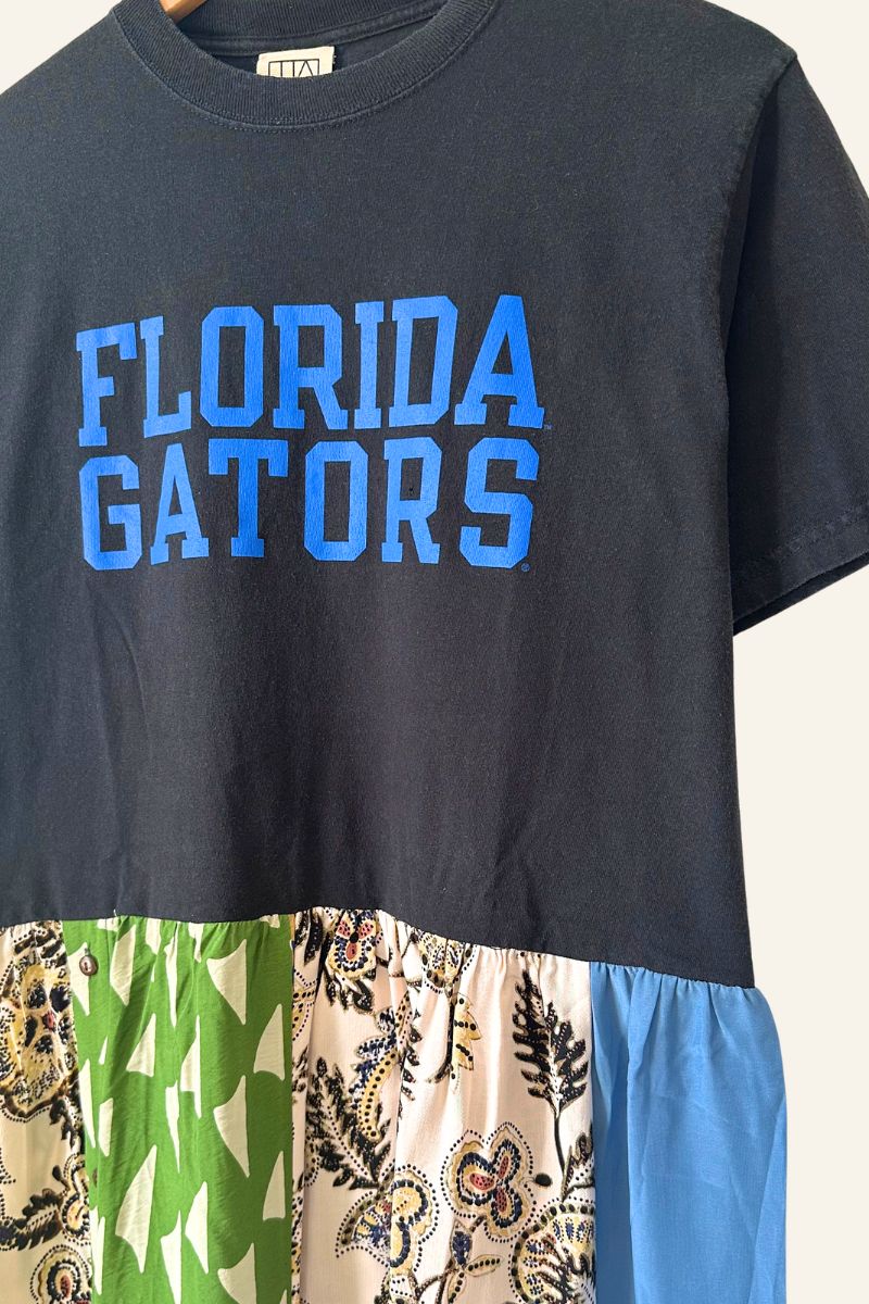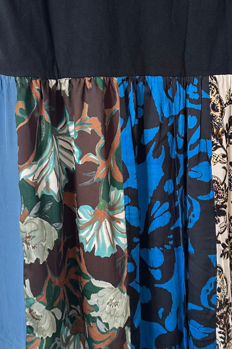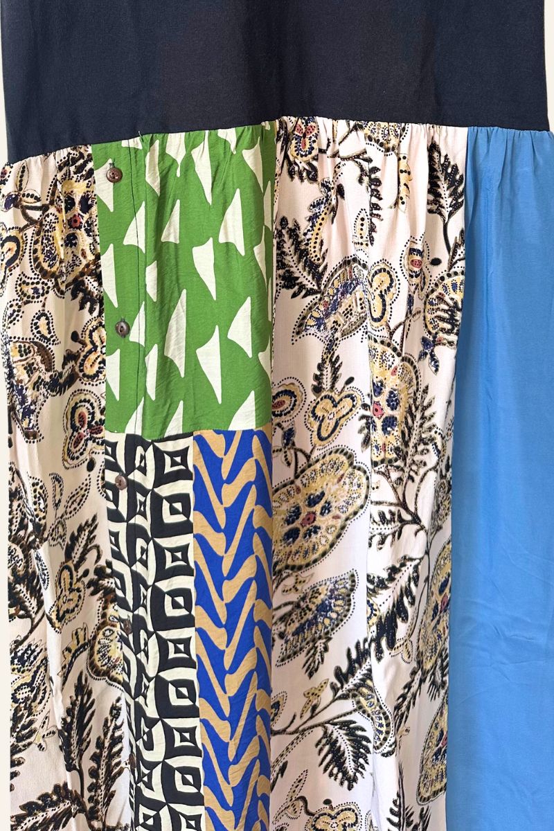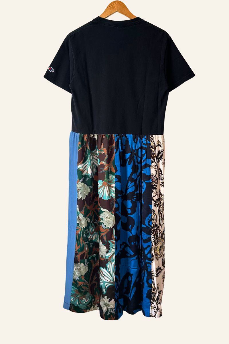 Robe, pièce unique réalisée à partir d’un tee-shirt vintage neuf USA et d’un patchwork d’ imprimés.