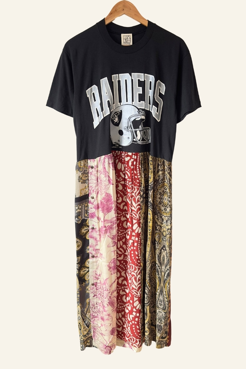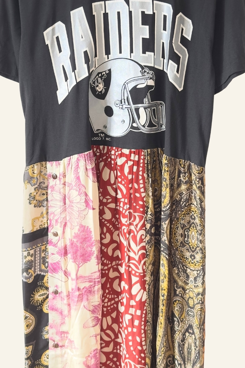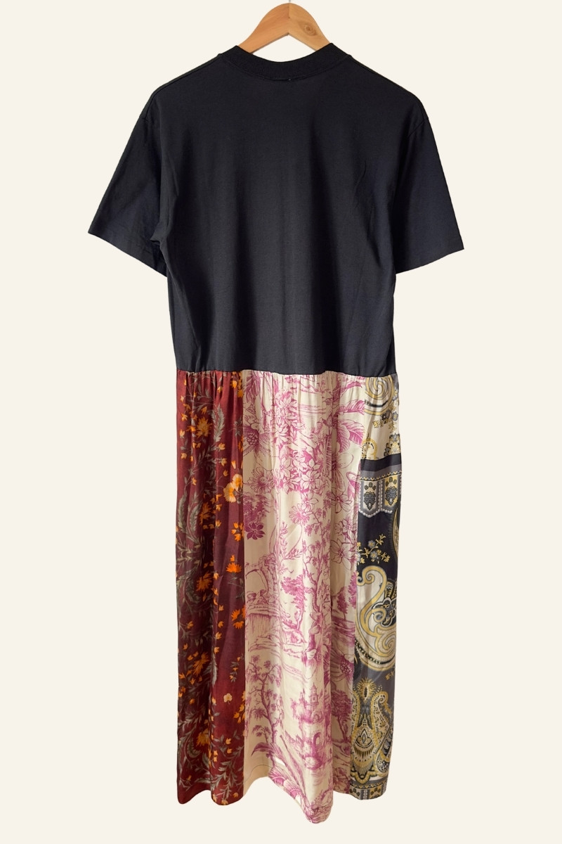 Robe, pièce unique réalisée à partir d’un tee-shirt vintage neuf Us et d’un patchwork d’ imprimés.
