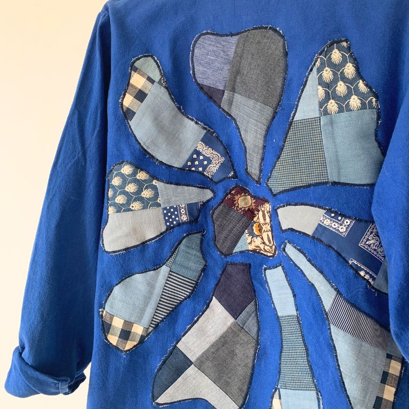 Le patchwork est réalisé avec des tissus upcyclés :jeans denim, bandana, broderies, imprimés fleurs… La broderie tout autour est marine et bleue à l’intérieur.